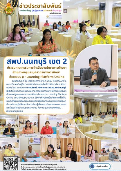 วันพฤหัสบดี ที่ 11 เดือน กรกฎาคม พ.ศ. 2567 เวลา 09.00 น. นายเทวัน พอใจ ผู้อำนวยการสำนักงานเขตพื้นที่การศึกษาประถมศึกษานนทบุรี เขต 2 มอบหมาย นายปรินทร์ ศรีษะเนตร รอง ผอ.สพป.นนทบุรี เขต 2 เป็นประธานการประชุมคณะกรรมการดำเนินงานโครงการพัฒนาศักยภาพครูและบุคลากรทางการศึกษา ด้วยระบบ e – Learning Platform Online ประจำปีงบประมาณ พ.ศ. 2567 เพื่อเสริมสร้างศักยภาพที่จำเป็นและสำคัญในการพัฒนางาน สามารถเรียนรู้ได้ตามกระบวนการของการพัฒนา นำองค์ความรู้ไปพัฒนาจัดการเรียนรู้เพื่อยกระดับคุณภาพของตนเองและผู้เรียนได้อย่างมีประสิทธิภาพ ณ ห้องประชุมนนทคุณพิพัฒน์ สพป.นนทบุรี เขต 2