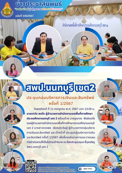 วันพฤหัสบดี ที่ 11 กรกฎาคม พ.ศ. 2567 เวลา 13.00 น. นายเทวัน พอใจ ผู้อำนวยการสำนักงานเขตพื้นที่การศึกษาประถมศึกษานนทบุรี เขต 2 พร้อมด้วย นายชูฌาณ พีรชัยเดโช รองผู้อำนวยการสำนักงานเขตพื้นที่การศึกษาประถมศึกษานนทบุรี เขต 2 นางสาวดวงพร เธียรประดิษฐ์ ผู้อำนวยการกลุ่มบริหารการเงินและสินทรัพย์ และเจ้าหน้าที่ ประชุมกลุ่มบริหารการเงินและสินทรัพย์ ครั้งที่ 1/2567 เพื่อชี้แจงข้อราชการและวางแผนการดำเนินงานให้เป็นไปตามเป้าหมาย ณ ห้องประชุมนฤมล ลี้กุลเจริญ สพป.นนทบุรี เขต 2