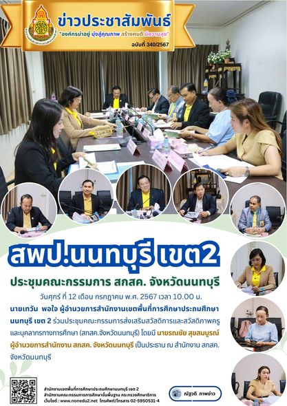 วันศุกร์ ที่ 12 เดือน กรกฎาคม พ.ศ. 2567 เวลา 10.00 น. นายเทวัน พอใจ ผู้อำนวยการสำนักงานเขตพื้นที่การศึกษาประถมศึกษานนทบุรี เขต 2 ร่วมประชุมคณะกรรมการส่งเสริมสวัสดิการและสวัสดิภาพครูและบุคลากรทางการศึกษา (สกสค.จังหวัดนนทบุรี) โดยมี นายรณชัย สุขสมบูรณ์ ผู้อำนวยการสำนักงาน สกสค. จังหวัดนนทบุรี เป็นประธาน ณ สำนักงาน สกสค. จังหวัดนนทบุรี