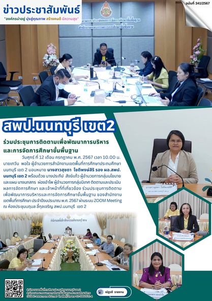 วันศุกร์ ที่ 12 เดือน กรกฎาคม พ.ศ. 2567 เวลา 10.00 น. นายเทวัน พอใจ ผู้อำนวยการสำนักงานเขตพื้นที่การศึกษาประถมศึกษานนทบุรี เขต 2 มอบหมาย นางสาวสุชดา โชติพงษ์สิริ รอง ผอ.สพป.นนทบุรี เขต 2 พร้อมด้วย นางประทีป สังข์แก้ว ผู้อำนวยการกลุ่มนโยบายและแผน นางนภสกร ผ่องอำไพ ผู้อำนวยการกลุ่มนิเทศ ติดตามและประเมินผลการจัดการศึกษา และเจ้าหน้าที่ที่เกี่ยวข้อง ร่วมประชุมการติดตามเพื่อพัฒนาการบริหารและการจัดการศึกษาขั้นพื้นฐาน ของสำนักงานเขตพื้นที่การศึกษา ประจำปีงบประมาณ พ.ศ. 2567 ผ่านระบบ ZOOM Meeting ณ ห้องประชุมนฤมล ลี้กุลเจริญ สพป.นนทบุรี เขต 2