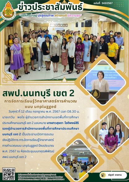 วันศุกร์ ที่ 12 เดือน กรกฎาคม พ.ศ. 2567 เวลา 08.30 น. นายเทวัน พอใจ ผู้อำนวยการสำนักงานเขตพื้นที่การศึกษาประถมศึกษานนทบุรี เขต 2 มอบหมาย นางสาวสุชดา โชติพงษ์สิริ รองผู้อำนวยการสำนักงานเขตพื้นที่การศึกษาประถมศึกษานนทบุรี เขต 2 เป็นประธานเปิดการอบรมเชิงปฏิบัติการ การจัดการเรียนรู้วิทยาศาสตร์การคำนวณแบบ unplugged ปีงบประมาณ พ.ศ. 2567 ณ ห้องประชุมนนทคุฒพิพัฒน์ สพป.นนทบุรี เขต 2