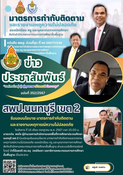 วันอังคาร ที่ 16 เดือน กรกฎาคม พ.ศ. 2567 เวลา 15.00 น. นายเทวัน พอใจ ผู้อำนวยการสำนักงานเขตพื้นที่การศึกษาประถมศึกษานนทบุรี เขต 2 ร่วมประชุมรับมอบนโยบาย มาตรการกำกับติดตามและรายงานเหตุการณ์ความไม่ปลอดภัย ของนักเรียน ครู และบุคลากรทางการศึกษาสังกัดสำนักงานคณะกรรมการการศึกษาขั้นพื้นฐาน ผ่านระบบอิเล็กทรอนิกส์ โดยมี ว่าที่ร้อยตรี ดร.ธนุ วงษ์จินดา เลขาธิการคณะกรรมการการศึกษาขั้นพื้นฐาน เป็นประธาน
