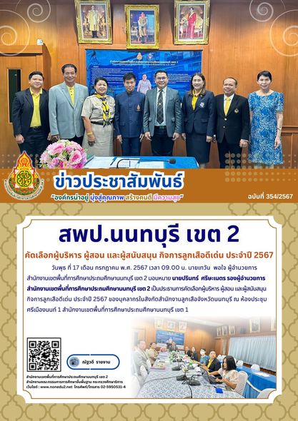 วันพุธ ที่ 17 เดือน กรกฎาคม พ.ศ. 2567 เวลา 09.00 น. นายเทวัน พอใจ ผู้อำนวยการสำนักงานเขตพื้นที่การศึกษาประถมศึกษานนทบุรี เขต 2 มอบหมาย นายปรินทร์ ศรีษะเนตร รองผู้อำนวยการสำนักงานเขตพื้นที่การศึกษาประถมศึกษานนทบุรี เขต 2 เป็นประธานการคัดเลือกผู้บริหาร ผู้สอน และผู้สนับสนุน กิจการลูกเสือดีเด่น ประจำปี 2567 ของบุคลากรในสังกัดสำนักงานลูกเสือจังหวัดนนทบุรี ณ ห้องประชุมศรีเมืองนนท์ 1 สำนักงานเขตพื้นที่การศึกษาประถมศึกษานนทบุรี เขต 1
