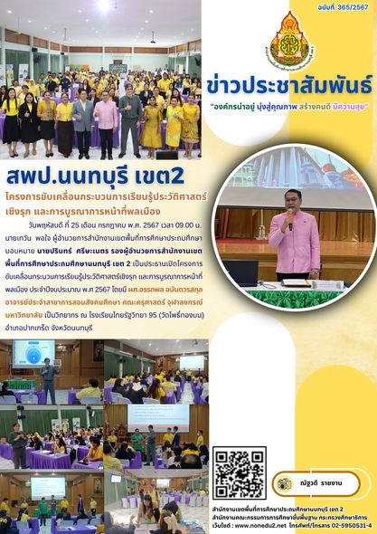 วันพฤหัสบดี ที่ 25 เดือน กรกฎาคม พ.ศ. 2567 เวลา 09.00 น. นายเทวัน พอใจ ผู้อำนวยการสำนักงานเขตพื้นที่การศึกษาประถมศึกษา มอบหมาย นายปรินทร์ ศรีษะเนตร รองผู้อำนวยการสำนักงานเขตพื้นที่การศึกษาประถมศึกษานนทบุรี เขต 2 เป็นประธานเปิดโครงการขับเคลื่อนกระบวนการเรียนรู้ประวัติศาสตร์เชิงรุก และการบูรณาการหน้าที่พลเมือง ประจำปีงบประมาณ พ.ศ 2567 โดยมี ผศ.อรรถพล อนันตวรสกุล อาจารย์ประจำสาขาการสอนสังคมศึกษา คณะครุศาสตร์ จุฬาลงกรณ์มหาวิทยาลัย เป็นวิทยากร ณ โรงเรียนไทยรัฐวิทยา 95 (วัดโพธิ์ทองบน) อำเภอปากเกร็ด จังหวัดนนทบุรี