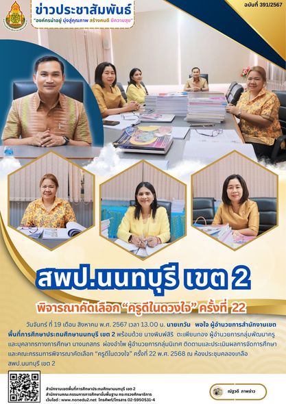 วันจันทร์ ที่ 19 เดือน สิงหาคม พ.ศ. 2567 เวลา 13.00 น. นายเทวัน พอใจ ผู้อำนวยการสำนักงานเขตพื้นที่การศึกษาประถมศึกษานนทบุรี เขต 2 พร้อมด้วย นางพิมพ์สิริ ตะเพียนทอง ผู้อำนวยการกลุ่มพัฒนาครูและบุคลากรทางการศึกษา นางนภสกร ผ่องอำไพ ผู้อำนวยการกลุ่มนิเทศ ติดตามและประเมินผลการจัดการศึกษา และคณะกรรมการพิจารณาคัดเลือก “ครูดีในดวงใจ” ครั้งที่ 22 พ.ศ. 2568 ณ ห้องประชุมคลองเกลือ สพป.นนทบุรี เขต 2