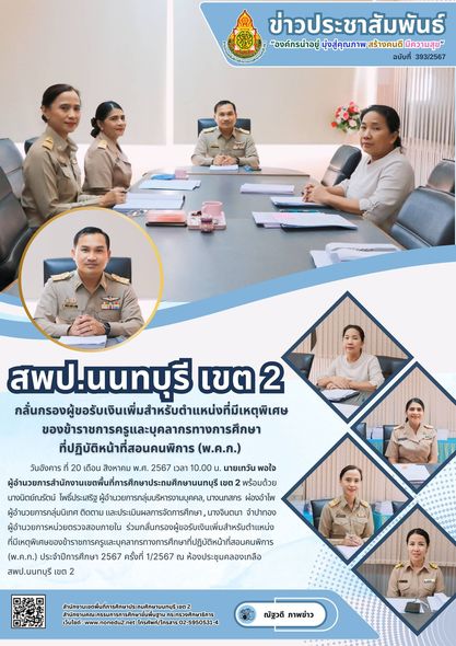 วันอังคาร ที่ 20 เดือน สิงหาคม พ.ศ. 2567 เวลา 10.00 น. นายเทวัน พอใจ ผู้อำนวยการสำนักงานเขตพื้นที่การศึกษาประถมศึกษานนทบุรี เขต 2 พร้อมด้วย นางนิตย์ณรัตน์ โพธิ์ประเสริฐ ผู้อำนวยการกลุ่มบริหารงานบุคคล, นางนภสกร ผ่องอำไพ ผู้อำนวยการกลุ่มนิเทศ ติดตาม และประเมินผลการจัดการศึกษา , นางจินตนา จำปาทอง ผู้อำนวยการหน่วยตรวจสอบภายใน ร่วมกลั่นกรองผู้ขอรับเงินเพิ่มสำหรับตำแหน่งที่มีเหตุพิเศษของข้าราชการครูและบุคลากรทางการศึกษาที่ปฏิบัติหน้าที่สอนคนพิการ (พ.ค.ก.) ประจำปีการศึกษา 2567 ครั้งที่ 1/2567 ณ ห้องประชุมคลองเกลือ สพป.นนทบุรี เขต 2