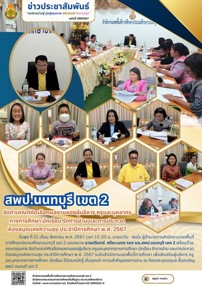 วันพุธ ที่ 21 เดือน สิงหาคม พ.ศ. 2567 เวลา 10.30 น. นายเทวัน พอใจ ผู้อำนวยการสำนักงานเขตพื้นที่การศึกษาประถมศึกษานนทบุรี เขต 2 มอบหมาย นายปรินทร์ ศรีษะเนตร รอง ผอ.สพป.นนทบุรี เขต 2 พร้อมด้วย คณะกรรมการ จัดทำเกณฑ์คัดเลือกผลงานของผู้บริหาร ครูและบุคลากรทางการศึกษา นักเรียน รักการอ่าน และการประกวดห้องสมุดแห่งความสุข ประจำปีการศึกษา พ.ศ. 2567 ระดับสำนักงานเขตพื้นที่การศึกษา เพื่อส่งเสริมผู้บริหาร ครู และบุคลากรทางการศึกษา นักเรียน ได้ตระหนักรู้ เห็นคุณค่า ความสำคัญของการอ่าน ณ ห้องประชุมนฤมล ลี้กุลเจริญ สพป.นนทบุรี เขต 2