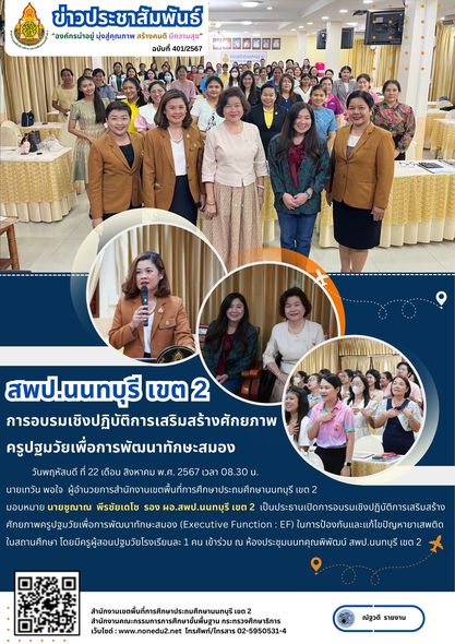 วันพฤหัสบดี ที่ 22 เดือน สิงหาคม พ.ศ. 2567 เวลา 08.30 น. นายเทวัน พอใจ ผู้อำนวยการสำนักงานเขตพื้นที่การศึกษาประถมศึกษานนทบุรี เขต 2 มอบหมาย นายชูฌาณ พีรชัยเดโช รอง ผอ.สพป.นนทบุรี เขต 2 เป็นประธานเปิดการอบรมเชิงปฏิบัติการเสริมสร้างศักยภาพครูปฐมวัยเพื่อการพัฒนาทักษะสมอง (Executive Function : EF) ในการป้องกันและแก้ไขปัญหายาเสพติดในสถานศึกษา โดยมีครูผู้สอนปฐมวัยโรงเรียนละ 1 คน เข้าร่วม ณ ห้องประชุมนนทคุณพิพัฒน์ สพป.นนทบุรี เขต 2