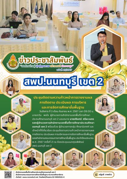 วันอังคาร ที่ 3 เดือน กันยายน พ.ศ. 2567 เวลา 09.00 น. นายเทวัน พอใจ ผู้อำนวยการสำนักงานเขตพื้นที่การศึกษาประถมศึกษานนทบุรี เขต 2 มอบหมาย นายปรินทร์ ศรีษะเนตร รองผู้อำนวยการสำนักงานเขตพื้นที่การศึกษาประถมศึกษานนทบุรี เขต 2 พร้อมด้วย ผู้อำนวยการกลุ่ม ศึกษานิเทศก์ และเจ้าหน้าที่ที่เกี่ยวข้อง ประชุมติดตามความก้าวหน้าการรายงานผลการติดตาม ประเมินผล การบริหารและการจัดการศึกษาขั้นพื้นฐานของสำนักงานคณะกรรมการการศึกษาขั้นพื้นฐาน ประจำปีงบประมาณ พ.ศ. 2567 (ครั้งที่ 2) ณ ห้องประชุมนนทคุณพิพัฒน์ สพป.นนทบุรี เขต 2