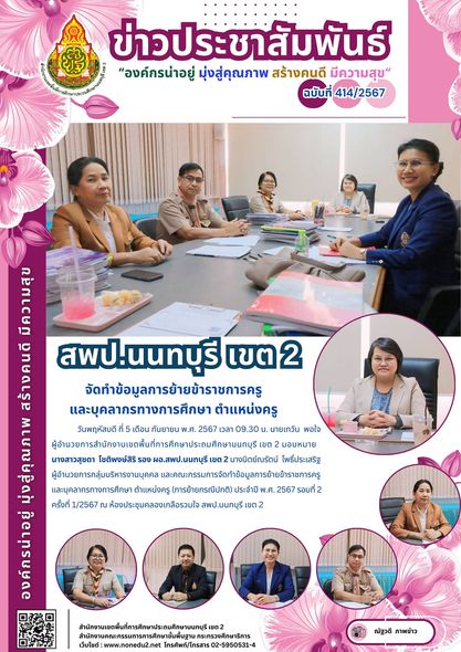 วันพฤหัสบดี ที่ 5 เดือน กันยายน พ.ศ. 2567 เวลา 09.30 น. นายเทวัน พอใจ ผู้อำนวยการสำนักงานเขตพื้นที่การศึกษาประถมศึกษานนทบุรี เขต 2 มอบหมาย นางสาวสุชดา โชติพงษ์สิริ รอง ผอ.สพป.นนทบุรี เขต 2 นางนิตย์ณรัตน์ โพธิ์ประเสริฐ ผู้อำนวยการกลุ่มบริหารงานบุคคล และคณะกรรมการจัดทำข้อมูลการย้ายข้าราชการครูและบุคลากรทางการศึกษา ตำแหน่งครู (การย้ายกรณีปกติ) ประจำปี พ.ศ. 2567 รอบที่ 2 ครั้งที่ 1/2567 ณ ห้องประชุมคลองเกลือรวมใจ สพป.นนทบุรี เขต 2