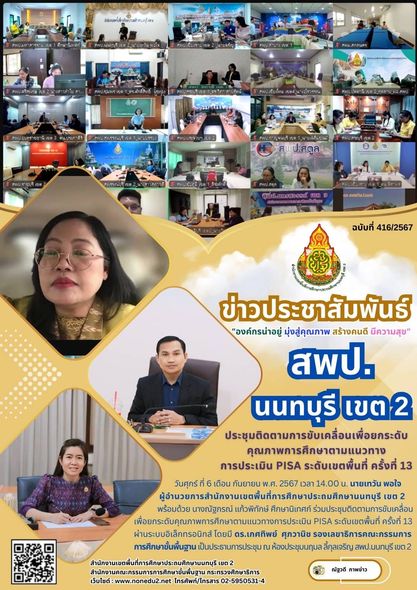 วันศุกร์ ที่ 6 เดือน กันยายน พ.ศ. 2567 เวลา 14.00 น. นายเทวัน พอใจ ผู้อำนวยการสำนักงานเขตพื้นที่การศึกษาประถมศึกษานนทบุรี เขต 2 พร้อมด้วย นางณัฐภรณ์ แก้วพิทักษ์ ศึกษานิเทศก์ ร่วมประชุมติดตามการขับเคลื่อนเพื่อยกระดับคุณภาพการศึกษาตามแนวทางการประเมิน PISA ระดับเขตพื้นที่ ครั้งที่ 13 ผ่านระบบอิเล็กทรอนิกส์ โดยมี ดร.เกศทิพย์ ศุภวานิช รองเลขาธิการคณะกรรมการการศึกษาขั้นพื้นฐาน เป็นประธานการประชุม ณ ห้องประชุมนฤมล ลี้กุลเจริญ สพป.นนทบุรี เขต 2