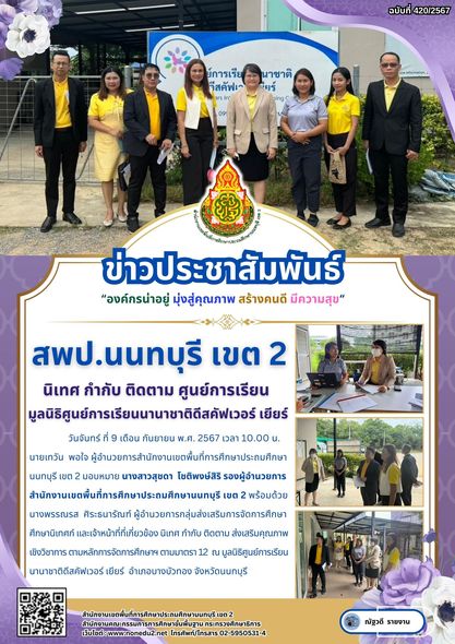 วันจันทร์ ที่ 9 เดือน กันยายน พ.ศ. 2567 เวลา 10.00 น. นายเทวัน พอใจ ผู้อำนวยการสำนักงานเขตพื้นที่การศึกษาประถมศึกษานนทบุรี เขต 2 มอบหมาย นางสาวสุชดา โชติพงษ์สิริ รองผู้อำนวยการสำนักงานเขตพื้นที่การศึกษาประถมศึกษานนทบุรี เขต 2 พร้อมด้วย นางพรรณรส ศิระธนารัณฑ์ ผู้อำนวยการกลุ่มส่งเสริมการจัดการศึกษาศึกษานิเทศก์ และเจ้าหน้าที่ที่เกี่ยวข้อง นิเทศ กำกับ ติดตาม ส่งเสริมคุณภาพเชิงวิชาการ ตามหลักการจัดการศึกษาฯ ตามมาตรา 12 ณ มูลนิธิศูนย์การเรียนนานาชาติดีสคัฟเวอร์ เยียร์ อำเภอบางบัวทอง จังหวัดนนทบุรี