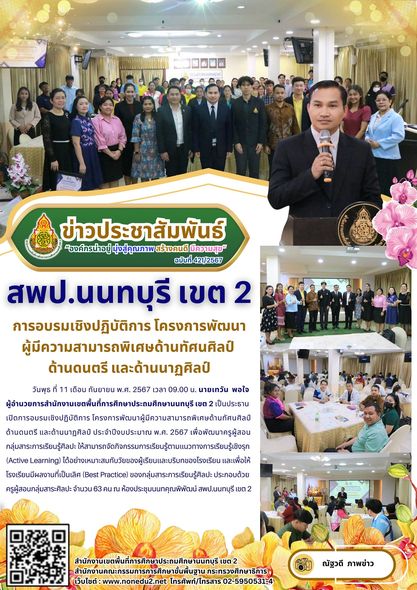 วันพุธ ที่ 11 เดือน กันยายน พ.ศ. 2567 เวลา 09.00 น. นายเทวัน พอใจ ผู้อำนวยการสำนักงานเขตพื้นที่การศึกษาประถมศึกษานนทบุรี เขต 2 เป็นประธานเปิดการอบรมเชิงปฏิบัติการ โครงการพัฒนาผู้มีความสามารถพิเศษด้านทัศนศิลป์ ด้านดนตรี และด้านนาฏศิลป์ ประจำปีงบประมาณ พ.ศ. 2567 เพื่อพัฒนาครูผู้สอนกลุ่มสาระการเรียนรู้ศิลปะ ให้สามารถจัดกิจกรรมการเรียนรู้ตามแนวทางการเรียนรู้เชิงรุก (Active Learning) ได้อย่างเหมาะสมกับวัยของผู้เรียนและบริบทของโรงเรียน และเพื่อให้โรงเรียนมีผลงานที่เป็นเลิศ (Best Practice) ของกลุ่มสาระการเรียนรู้ศิลปะ ประกอบด้วยครูผู้สอนกลุ่มสาระศิลปะ จำนวน 63 คน ณ ห้องประชุมนนทคุณพิพัฒน์ สพป.นนทบุรี เขต 2