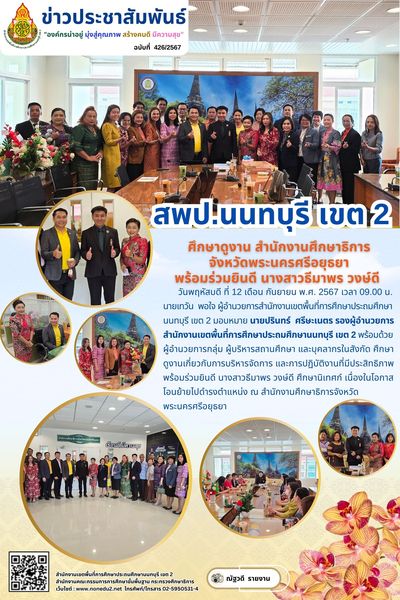 วันพฤหัสบดี ที่ 12 เดือน กันยายน พ.ศ. 2567 เวลา 09.00 น. นายเทวัน พอใจ ผู้อำนวยการสำนักงานเขตพื้นที่การศึกษาประถมศึกษานนทบุรี เขต 2 มอบหมาย นายปรินทร์ ศรีษะเนตร รองผู้อำนวยการสำนักงานเขตพื้นที่การศึกษาประถมศึกษานนทบุรี เขต 2 พร้อมด้วย ผู้อำนวยการกลุ่ม ผู้บริหารสถานศึกษา และบุคลากรในสังกัด ศึกษาดูงานเกี่ยวกับการบริหารจัดการ และการปฏิบัติงานที่มีประสิทธิภาพพร้อมร่วมยินดี นางสาวธีมาพร วงษ์ดี ศึกษานิเทศก์ เนื่องในโอกาสโอนย้ายไปดำรงตำแหน่ง ณ สำนักงานศึกษาธิการจังหวัดพระนครศรีอยุธยา