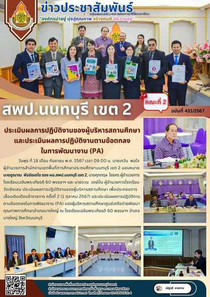 วันพุธ ที่ 18 เดือน กันยายน พ.ศ. 2567 เวลา 09.00 น. นายเทวัน พอใจ ผู้อำนวยการสำนักงานเขตพื้นที่การศึกษาประถมศึกษานนทบุรี เขต 2 มอบหมาย นายชูฌาณ พีรชัยเดโช รอง ผอ.สพป.นนทบุรี เขต 2, นายศุภกฤษ ไชยศร ผู้อำนวยการโรงเรียนเฉลิมพระเกียรติ 60 พรรษาฯ และ นายจวน วงษ์ปิ่น ผู้อำนวยการโรงเรียนวัดเชิงเลน ประเมินผลการปฏิบัติงานของผู้บริหารสถานศึกษา เพื่อประกอบการเลื่อนเงินเดือนข้าราชการ ครั้งที่ 2 (1 ตุลาคม 2567) และประเมินผลการปฏิบัติงานตามข้อตกลงในการพัฒนางาน (PA) ของผู้บริหารสถานศึกษาศูนย์เครือข่ายพัฒนาคุณภาพการศึกษาอำเภอบางใหญ่ ณ โรงเรียนเฉลิมพระเกียรติ 60 พรรษาฯ อำเภอบางใหญ่ จังหวัดนนทบุรี
