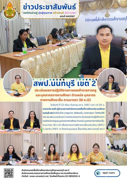 วันจันทร์ ที่ 23 เดือน กันยายน พ.ศ. 2567 เวลา 14.00 น. นายเทวัน พอใจ ผู้อำนวยการสำนักงานเขตพื้นที่การศึกษาประถมศึกษานนทบุรี เขต 2 พร้อมด้วย นายชูฌาณ พีรชัยเดโช, นางสาวสุชดา โชติพงษ์สิริ รอง ผอ.สพป.นนทบุรี เขต 2 และคณะกรรมการ ประเมินผลการปฏิบัติราชการของข้าราชการครูและบุคลากรทางการศึกษา ตำแหน่ง บุคลากรทางการศึกษาอื่น ตามมาตรา 38 ค.(2) เพื่อประกอบการพิจารณาเลื่อนเงินเดือน ครั้งที่ 2 (1 ตุลาคม 2567) ณ ห้องประชุมนฤมล ลี้กุลเจริญ สพป.นนทบุรี เขต 2