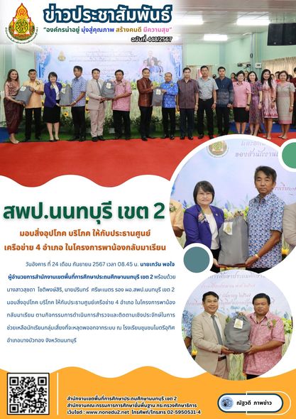 วันอังคาร ที่ 24 เดือน กันยายน 2567 เวลา 08.45 น. นายเทวัน พอใจ ผู้อำนวยการสำนักงานเขตพื้นที่การศึกษาประถมศึกษานนทบุรี เขต 2 พร้อมด้วย นางสาวสุชดา โชติพงษ์สิริ, นายปรินทร์ ศรีษะเนตร รอง ผอ.สพป.นนทบุรี เขต 2 มอบสิ่งอุปโภค บริโภค ให้กับประธานศูนย์เครือข่าย 4 อำเภอ ในโครงการพาน้องกลับมาเรียน ตามกิจกรรมการดำเนินการสำรวจและติดตามเชิงประจักษ์ในการช่วยเหลือนักเรียนกลุ่มเสี่ยงที่จะหลุดพออกจากระบบ ณ โรงเรียนชุมชนไมตรีอุทิศ อำเภอบางบัวทอง จังหวัดนนทบุรี