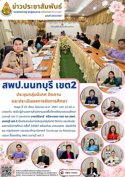 วันพุธ ที่ 25 เดือน กันยายน พ.ศ. 2567 เวลา 13.30 น. นายเทวัน พอใจ ผู้อำนวยการสำนักงานเขตพื้นที่การศึกษาประถมศึกษานนทบุรี เขต 2 มอบหมาย นายปรินทร์ ศรีษะเนตร รอง ผอ.สพป.นนทบุรี เขต 2 เป็นประธานในการประชุมกลุ่มนิเทศ ติดตาม และประเมินผลการจัดการศึกษา ครั้งที่ 3/2567 พร้อมด้วย นางนภสกร ผ่องอำไพ ผอ.กลุ่มนิเทศฯ และคณะศึกษานิเทศก์ ร่วมประชุม ณ ห้องประชุมนฤมล ลี้กุลเจริญ สพป.นนทบุรี เขต 2