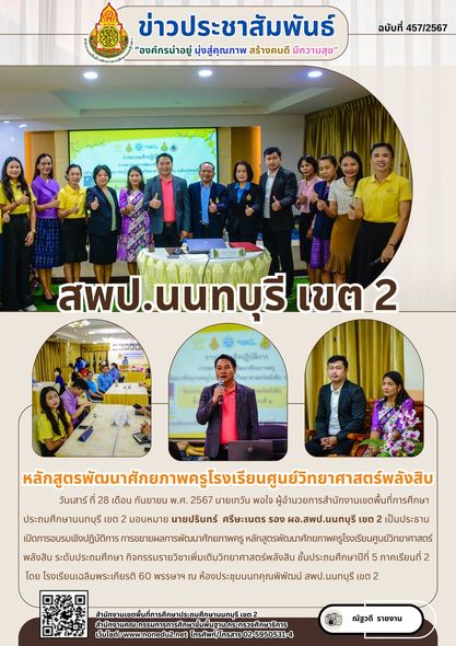 วันเสาร์ ที่ 28 เดือน กันยายน พ.ศ. 2567 นายเทวัน พอใจ ผู้อำนวยการสำนักงานเขตพื้นที่การศึกษาประถมศึกษานนทบุรี เขต 2 มอบหมาย นายปรินทร์ ศรีษะเนตร รอง ผอ.สพป.นนทบุรี เขต 2 เป็นประธานเปิดการอบรมเชิงปฏิบัติการ การขยายผลการพัฒนาศักยภาพครู หลักสูตรพัฒนาศักยภาพครูโรงเรียนศูนย์วิทยาศาสตร์พลังสิบ ระดับประถมศึกษา กิจกรรมรายวิชาเพิ่มเติมวิทยาศาสตร์พลังสิบ ชั้นประถมศึกษาปีที่ 5 ภาคเรียนที่ 2 โดย โรงเรียนเฉลิมพระเกียรติ 60 พรรษาฯ ณ ห้องประชุมนนทคุณพิพัฒน์ สพป.นนทบุรี เขต 2