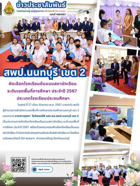 วันศุกร์ ที่ 27 เดือน กันยายน พ.ศ. 2567 นายเทวัน พอใจ ผู้อำนวยการสำนักงานเขตพื้นที่การศึกษาประถมศึกษานนทบุรี เขต 2 มอบหมาย นางสาวสุชดา โชติพงษ์สิริ รอง ผอ.สพป.นนทบุรี เขต 2 เป็นประธานการคัดเลือกโรงเรียนต้นแบบสภานักเรียน ระดับเขตพื้นที่การศึกษา ประจำปี 2567 พร้อมด้วยคณะกรรมคัดเลือกโรงเรียนต้นแบบสภานักเรียน ดำเนินการประเมินผลงานเชิงประจักษ์สภานักเรียน ณ โรงเรียนเฉลิมพระเกียรติ 60 พรรษาฯ อำเภอบางใหญ่ จังหวัดนนทบุรี