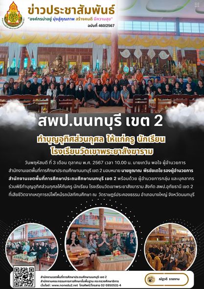 วันพฤหัสบดี ที่ 3 เดือน ตุลาคม พ.ศ. 2567 เวลา 10.00 น. นายเทวัน พอใจ ผู้อำนวยการสำนักงานเขตพื้นที่การศึกษาประถมศึกษานนทบุรี เขต 2 มอบหมาย นายชูฌาณ พีรชัยเดโช รองผู้อำนวยการสำนักงานเขตพื้นที่การศึกษาประถมศึกษานนทบุรี เขต 2 พร้อมด้วย ผู้อำนวยการกลุ่ม และบุคลากร ร่วมพิธีทำบุญอุทิศส่วนกุศลให้กับครู นักเรียน โรงเรียนวัดเขาพระยาสังฆาราม สังกัด สพป.อุทัยธานี เขต 2 ที่เสียชีวิตจากเหตุการณ์ไฟไหม้รถบัสทัศนศึกษา ณ วัดราษฎร์ประคองธรรม อำเภอบางใหญ่ จังหวัดนนทบุรี