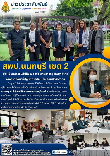 วันศุกร์ ที่ 4 เดือน ตุลาคม พ.ศ. 2567 เวลา 13.00 น. นายเทวัน พอใจ ผู้อำนวยการสำนักงานเขตพื้นที่การศึกษาประถมศึกษานนทบุรี เขต 2 มอบหมาย นางสาวสุชดา โชติพงษ์สิริ รอง ผอ.สพป.นนทบุรี เขต 2 พร้อมด้วย คณะกรรมการประเมินผลการปฏิบัติงานของข้าราชการครูและบุคลากรทางการศึกษา สังกัด สพป.นนทบุรี เขต 2 ที่ปฏิบัติการสอนในโรงเรียนศรีสังวาลย์ เพื่อประกอบการเลื่อนเงินเดือนข้าราชการครูและบุคลากรทางการศึกษา ครั้งที่ 2 (1 ตุลาคม 2567) ณ โรงเรียนศรีสังวาลย์ อำเภอปากเกร็ด จังหวัดนนทบุรี