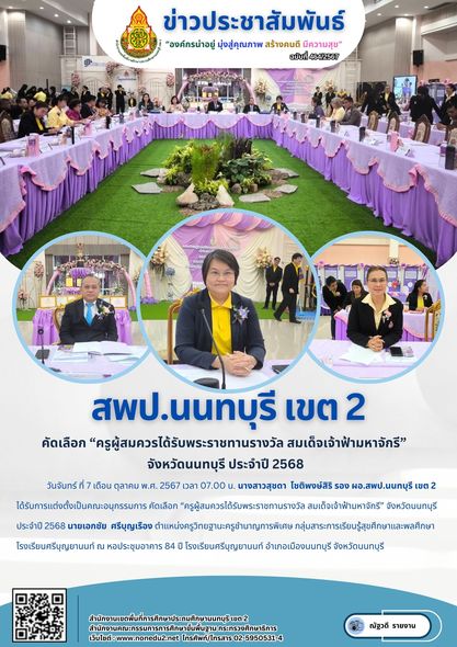 วันจันทร์ ที่ 7 เดือน ตุลาคม พ.ศ. 2567 เวลา 07.00 น. นางสาวสุชดา โชติพงษ์สิริ รอง ผอ.สพป.นนทบุรี เขต 2 ได้รับการแต่งตั้งเป็นคณะอนุกรรมการ คัดเลือก “ครูผู้สมควรได้รับพระราชทานรางวัล สมเด็จเจ้าฟ้ามหาจักรี” จังหวัดนนทบุรี ประจำปี 2568 นายเอกชัย ศรีบุญเรือง ตำแหน่งครูวิทยฐานะครูชำนาญการพิเศษ กลุ่มสาระการเรียนรู้สุขศึกษาและพลศึกษา โรงเรียนศรีบุญยานนท์ ณ หอประชุมอาคาร 84 ปี โรงเรียนศรีบุญยานนท์ อำเภอเมืองนนทบุรี จังหวัดนนทบุรี