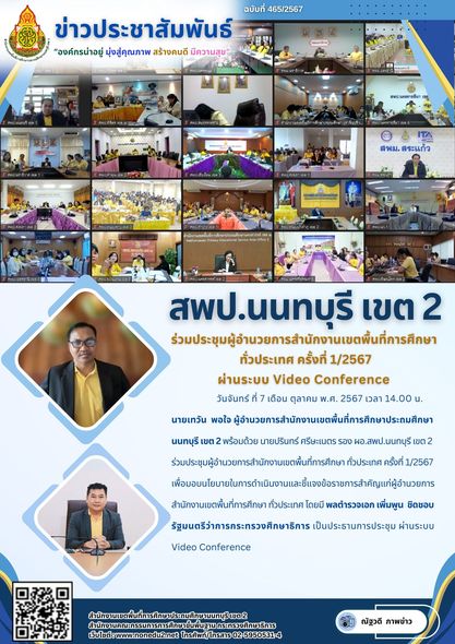 วันจันทร์ ที่ 7 เดือน ตุลาคม พ.ศ. 2567 เวลา 14.00 น. นายเทวัน พอใจ ผู้อำนวยการสำนักงานเขตพื้นที่การศึกษาประถมศึกษานนทบุรี เขต 2 พร้อมด้วย นายปรินทร์ ศรีษะเนตร รอง ผอ.สพป.นนทบุรี เขต 2 ร่วมประชุมผู้อำนวยการสำนักงานเขตพื้นที่การศึกษา ทั่วประเทศ ครั้งที่ 1/2567 เพื่อมอบนโยบายในการดำเนินงานและชี้แจงข้อราชการสำคัญแก่ผู้อำนวยการสำนักงานเขตพื้นที่การศึกษา ทั่วประเทศ โดยมี พลตำรวจเอก เพิ่มพูน ชิดชอบ รัฐมนตรีว่าการกระทรวงศึกษาธิการ เป็นประธานการประชุม ผ่านระบบ