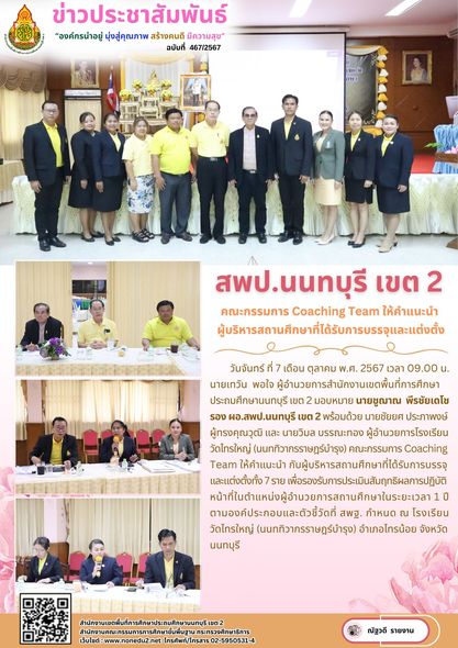 วันจันทร์ ที่ 7 เดือน ตุลาคม พ.ศ. 2567 เวลา 09.00 น. นายเทวัน พอใจ ผู้อำนวยการสำนักงานเขตพื้นที่การศึกษาประถมศึกษานนทบุรี เขต 2 มอบหมาย นายชูฌาณ พีรชัยเดโช รอง ผอ.สพป.นนทบุรี เขต 2 พร้อมด้วย นายชัยยศ ประภาพงษ์ ผู้ทรงคุณวุฒิ และ นายวิมล บรรณะทอง ผู้อำนวยการโรงเรียนวัดไทรใหญ่ (นนททิวากรราษฎร์บำรุง) คณะกรรมการ Coaching Team ให้คำแนะนำ กับผู้บริหารสถานศึกษาที่ได้รับการบรรจุและแต่งตั้งทั้ง 7 ราย เพื่อรองรับการประเมินสัมฤทธิผลการปฏิบัติหน้าที่ในตำแหน่งผู้อำนวยการสถานศึกษาในระยะเวลา 1 ปี ตามองค์ประกอบและตัวชี้วัดที่ สพฐ. กำหนด ณ โรงเรียนวัดไทรใหญ่ (นนททิวากรราษฎร์บำรุง) อำเภอไทรน้อย จังหวัดนนทบุรี