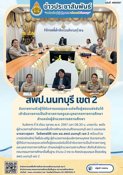 วันอังคาร ที่ 8 เดือน ตุลาคม พ.ศ. 2567 เวลา 08.30 น. นายเทวัน พอใจ ผู้อำนวยการสำนักงานเขตพื้นที่การศึกษาประถมศึกษานนทบุรี เขต 2 มอบหมาย นางสาวสุชดา โชติพงษ์สิริ รอง ผอ.สพป.นนทบุรี เขต 2 พร้อมด้วย นางนิตย์ณรัตน์ โพธิ์ประเสริฐ ผู้อำนวยการกลุ่มบริหารงานบุคคล รับรายงานตัวผู้ได้รับการบรรจุและแต่งตั้งผู้สอบแข่งขันได้เข้ารับราชการเป็นข้าราชการครูและบุคลากรทางการศึกษา ตำแหน่งผู้อำนวยการสถานศึกษา สังกัดสำนักงานคณะกรรมการการศึกษาขั้นพื้นฐาน จำนวน 2 ราย ณ ห้องประชุมนฤมล ลี้กุลเจริญ สพป.นนทบุรี เขต 2