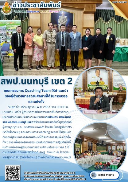 วันพุธ ที่ 9 เดือน ตุลาคม พ.ศ. 2567 เวลา 09.00 น. นายเทวัน พอใจ ผู้อำนวยการสำนักงานเขตพื้นที่การศึกษาประถมศึกษานนทบุรี เขต 2 มอบหมาย นายปรินทร์ ศรีษะเนตร รอง ผอ.สพป.นนทบุรี เขต 2 พร้อมด้วย นายเทิดศักดิ์ สุวรรณรงค์ ผู้ทรงคุณวุฒิ และ นายสิริพงษ์ แพงคำ โรงเรียนไทยรัฐวิทยา 95 (วัดโพธิ์ทองบน) คณะกรรมการ Coaching Team ให้คำแนะนำ กับรองผู้อำนวยการสถานศึกษาที่ได้รับการบรรจุและแต่งตั้ง ทั้ง 5 ราย เพื่อรองรับการประเมินสัมฤทธิผลการปฏิบัติหน้าที่ในตำแหน่งรองผู้อำนวยการสถานศึกษาในระยะเวลา 1 ปี ตามองค์ประกอบและตัวชี้วัดที่ สพฐ. กำหนด ณ โรงเรียนไทยรัฐวิทยา 95 (วัดโพธิ์ทองบน) อำเภอปากเกร็ด จังหวัดนนทบุรี