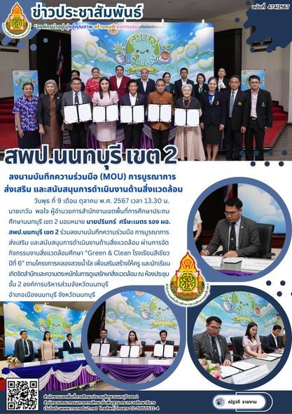 วันพุธ ที่ 9 เดือน ตุลาคม พ.ศ. 2567 เวลา 13.30 น. นายเทวัน พอใจ ผู้อำนวยการสำนักงานเขตพื้นที่การศึกษาประถมศึกษานนทบุรี เขต 2 มอบหมาย นายปรินทร์ ศรีษะเนตร รอง ผอ.สพป.นนทบุรี เขต 2 ร่วมลงนามบันทึกความร่วมมือ การบูรณาการส่งเสริม และสนับสนุนการดำเนินงานด้านสิ่งแวดล้อม ผ่านการจัดกิจกรรมงานสิ่งแวดล้อมศึกษา “Green & Clean โรงเรียนสีเขียวปีที่ 6” ตามโครงการคลองสวยน้ำใส เพื่อเสริมสร้างให้ครู และนักเรียนเกิดจิตสำนึกและความตระหนักในการดูแลรักษาสิ่งแวดล้อม ณ ห้องประชุม ชั้น 2 องค์การบริหารส่วนจังหวัดนนทบุรี อำเภอเมืองนนทบุรี จังหวัดนนทบุรี