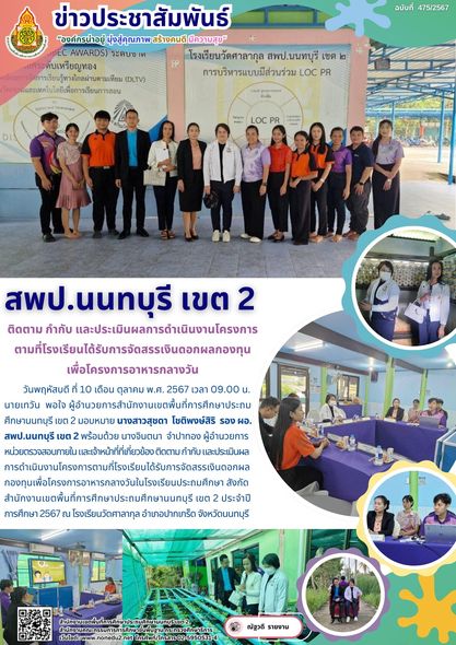 วันพฤหัสบดี ที่ 10 เดือน ตุลาคม พ.ศ. 2567 เวลา 09.00 น. นายเทวัน พอใจ ผู้อำนวยการสำนักงานเขตพื้นที่การศึกษาประถมศึกษานนทบุรี เขต 2 มอบหมาย นางสาวสุชดา โชติพงษ์สิริ รอง ผอ.สพป.นนทบุรี เขต 2 พร้อมด้วย นางจินตนา จำปาทอง ผู้อำนวยการหน่วยตรวจสอบภายใน และเจ้าหน้าที่ที่เกี่ยวข้อง ติดตาม กำกับ และประเมินผลการดำเนินงานโครงการตามที่โรงเรียนได้รับการจัดสรรเงินดอกผลกองทุนเพื่อโครงการอาหารกลางวันในโรงเรียนประถมศึกษา สังกัดสำนักงานเขตพื้นที่การศึกษาประถมศึกษานนทบุรี เขต 2 ประจำปีการศึกษา 2567 ณ โรงเรียนวัดศาลากุล อำเภอปากเกร็ด จังหวัดนนทบุรี