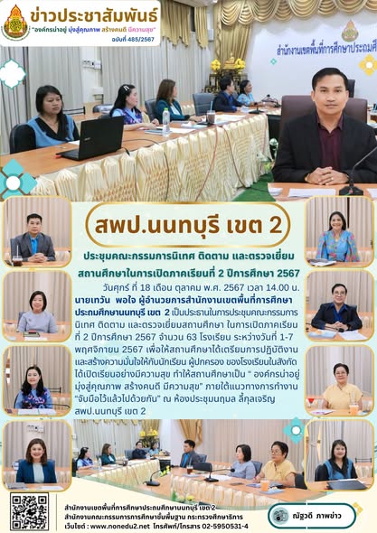 วันศุกร์ ที่ 18 เดือน ตุลาคม พ.ศ. 2567 เวลา 14.00 น. นายเทวัน พอใจ ผู้อำนวยการสำนักงานเขตพื้นที่การศึกษาประถมศึกษานนทบุรี เขต 2 เป็นประธานในการประชุมคณะกรรมการนิเทศ ติดตาม และตรวจเยี่ยมสถานศึกษา ในการเปิดภาคเรียนที่ 2 ปีการศึกษา 2567 จำนวน 63 โรงเรียน ระหว่างวันที่ 1-7 พฤศจิกายน 2567 เพื่อให้สถานศึกษาได้เตรียมการปฏิบัติงานและสร้างความมั่นใจให้กับนักเรียน ผู้ปกครอง ของโรงเรียนในสังกัดได้เปิดเรียนอย่างมีความสุข ทำให้สถานศึกษาเป็น “ องค์กรน่าอยู่ มุ่งสู่คุณภาพ สร้างคนดี มีความสุข” ภายใต้แนวทางการทำงาน“จับมือไว้แล้วไปด้วยกัน” ณ ห้องประชุมนฤมล ลี้กุลเจริญ สพป.นนทบุรี เขต 2