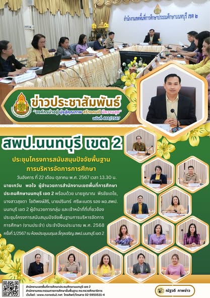 วันอังคาร ที่ 22 เดือน ตุลาคม พ.ศ. 2567 เวลา 13.30 น. นายเทวัน พอใจ ผู้อำนวยการสำนักงานเขตพื้นที่การศึกษาประถมศึกษานนทบุรี เขต 2 พร้อมด้วย นายชูฌาณ พีรชัยเดโช, นางสาวสุชดา โชติพงษ์สิริ, นายปรินทร์ ศรีษะเนตร รอง ผอ.สพป.นนทบุรี เขต 2 ผู้อำนวยการกลุ่ม และเจ้าหน้าที่ที่เกี่ยวข้อง ประชุมโครงการสนับสนุนปัจจัยพื้นฐานการบริหารจัดการการศึกษา (งานประจำ) ประจำปีงบประมาณ พ.ศ. 2568 ครั้งที่ 1/2567 ณ ห้องประชุมนฤมล ลี้กุลเจริญ สพป.นนทบุรี เขต 2