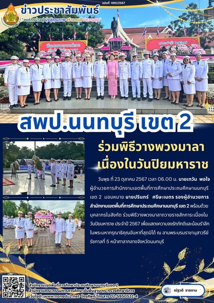 วันพุธ ที่ 23 ตุลาคม 2567 เวลา 06.00 น. นายเทวัน พอใจ ผู้อำนวยการสำนักงานเขตพื้นที่การศึกษาประถมศึกษานนทบุรี เขต 2 มอบหมาย นายปรินทร์ ศรีษะเนตร รองผู้อำนวยการสำนักงานเขตพื้นที่การศึกษาประถมศึกษานนทบุรี เขต 2 พร้อมด้วย บุคลากรในสังกัด ร่วมพิธีวางพวงมาลาถวายราชสักการะเนื่องในวันปิยมหาราช ประจำปี 2567 เพื่อแสดงความจงรักภักดีและน้อมรำลึกในพระมหากรุณาธิคุณอันหาที่สุดมิได้ ณ ลานพระบรมราชานุสาวรีย์ รัชกาลที่ 5 หน้าศาลากลางจังหวัดนนทบุรี