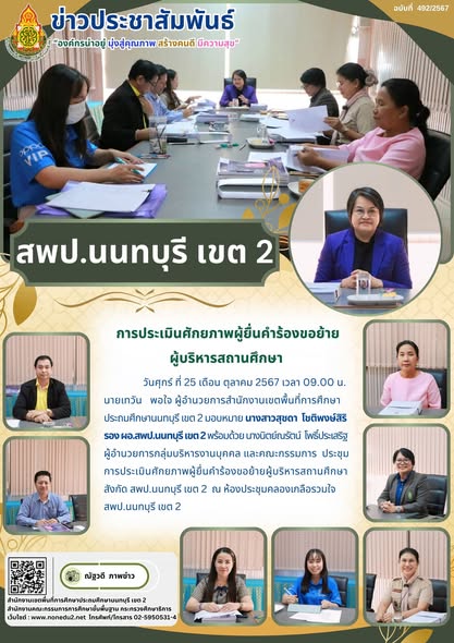 วันศุกร์ ที่ 25 เดือน ตุลาคม 2567 เวลา 09.00 น. นายเทวัน พอใจ ผู้อำนวยการสำนักงานเขตพื้นที่การศึกษาประถมศึกษานนทบุรี เขต 2 มอบหมาย นางสาวสุชดา โชติพงษ์สิริ รอง ผอ.สพป.นนทบุรี เขต 2 พร้อมด้วย นางนิตย์ณรัตน์ โพธิ์ประเสริฐ ผู้อำนวยการกลุ่มบริหารงานบุคคล และคณะกรรมการ ประชุมการประเมินศักยภาพผู้ยื่นคำร้องขอย้ายผู้บริหารสถานศึกษา สังกัด สพป.นนทบุรี เขต 2 ณ ห้องประชุมคลองเกลือรวมใจ สพป.นนทบุรี เขต 2