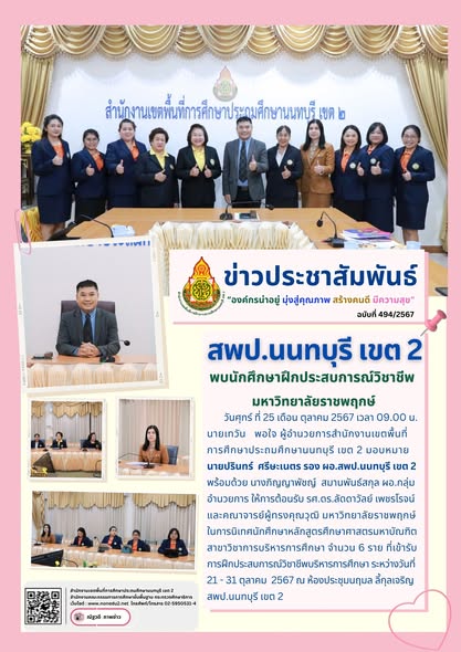 วันศุกร์ ที่ 25 เดือน ตุลาคม 2567 เวลา 09.00 น. นายเทวัน พอใจ ผู้อำนวยการสำนักงานเขตพื้นที่การศึกษาประถมศึกษานนทบุรี เขต 2 มอบหมาย นายปรินทร์ ศรีษะเนตร รอง ผอ.สพป.นนทบุรี เขต 2 พร้อมด้วย นางภิญญาพัชญ์ สมานพันธ์สกุล ผอ.กลุ่มอำนวยการ ให้การต้อนรับ รศ.ดร.ลัดดาวัลย์ เพชรโรจน์ และคณาจารย์ผู้ทรงคุณวุฒิ มหาวิทยาลัยราชพฤกษ์ ในการนิเทศนักศึกษาหลักสูตรศึกษาศาสตรมหาบัณฑิต สาขาวิชาการบริหารการศึกษา จำนวน 6 ราย ที่เข้ารับการฝึกประสบการณ์วิชาชีพบริหารการศึกษา ระหว่างวันที่ 21 – 31 ตุลาคม 2567 ณ ห้องประชุมนฤมล ลี้กุลเจริญ สพป.นนทบุรี เขต 2
