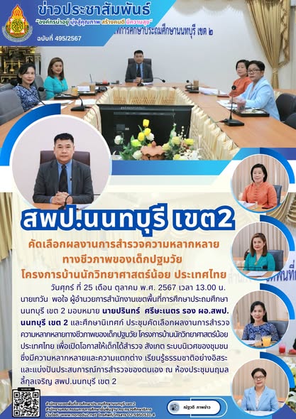 วันศุกร์ ที่ 25 เดือน ตุลาคม พ.ศ. 2567 เวลา 13.00 น. นายเทวัน พอใจ ผู้อำนวยการสำนักงานเขตพื้นที่การศึกษาประถมศึกษานนทบุรี เขต 2 มอบหมาย นายปรินทร์ ศรีษะเนตร รอง ผอ.สพป.นนทบุรี เขต 2 และศึกษานิเทศก์ ประชุมคัดเลือกผลงานการสำรวจความหลากหลายทางชีวภาพของเด็กปฐมวัย โครงการบ้านนักวิทยาศาสตร์น้อยประเทศไทย เพื่อเปิดโอกาสให้เด็กได้สำรวจ สังเกต ระบบนิเวศของชุมชนซึ่งมีความหลากหลายและความแตกต่าง เรียนรู้ธรรมชาติอย่างอิสระและแบ่งปันประสบการณ์การสำรวจของตนเอง ณ ห้องประชุมนฤมล ลี้กุลเจริญ สพป.นนทบุรี เขต 2