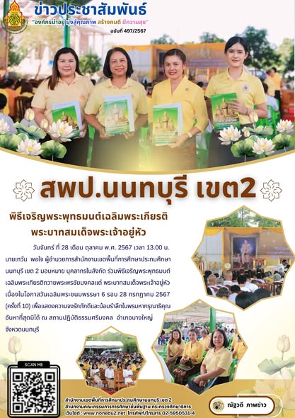 วันจันทร์ ที่ 28 เดือน ตุลาคม พ.ศ. 2567 เวลา 13.00 น. นายเทวัน พอใจ ผู้อำนวยการสำนักงานเขตพื้นที่การศึกษาประถมศึกษานนทบุรี เขต 2 มอบหมาย บุคลากรในสังกัด ร่วมพิธีเจริญพระพุทธมนต์เฉลิมพระเกียรติถวายพระพรชัยมงคลแด่ พระบาทสมเด็จพระเจ้าอยู่หัวเนื่องในโอกาสวันเฉลิมพระชนมพรรษา 6 รอบ 28 กรกฎาคม 2567 (ครั้งที่ 10) เพื่อแสดงความจงรักภักดีและน้อมรำลึกในพรมหากรุณาธิคุณอันหาที่สุดมิได้ ณ สถานปฏิบัติธรรมศรีมงคล อำเภอบางใหญ่ จังหวดนนทบุรี