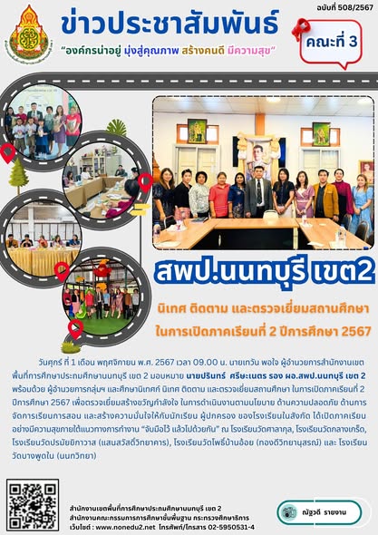 วันศุกร์ ที่ 1 เดือน พฤศจิกายน พ.ศ. 2567 เวลา 09.00 น. นายเทวัน พอใจ ผู้อำนวยการสำนักงานเขตพื้นที่การศึกษาประถมศึกษานนทบุรี เขต 2 มอบหมาย นายปรินทร์ ศรีษะเนตร รอง ผอ.สพป.นนทบุรี เขต 2 พร้อมด้วย ผู้อำนวยการกลุ่มฯ และศึกษานิเทศก์ นิเทศ ติดตาม และตรวจเยี่ยมสถานศึกษา ในการเปิดภาคเรียนที่ 2 ปีการศึกษา 2567 เพื่อตรวจเยี่ยมสร้างขวัญกำลังใจ ในการดำเนินงานตามนโยบาย ด้านความปลอดภัย ด้านการจัดการเรียนการสอน และสร้างความมั่นใจให้กับนักเรียน ผู้ปกครอง ของโรงเรียนในสังกัด ได้เปิดภาคเรียนอย่างมีความสุขภายใต้แนวทางการทำงาน “จับมือไว้ แล้วไปด้วยกัน” ณ โรงเรียนวัดศาลากุล, โรงเรียนวัดกลางเกร็ด, โรงเรียนวัดปรมัยยิกาวาส (แสนสวัสดิ์วิทยาคาร), โรงเรียนวัดโพธิ์บ้านอ้อย (ทองดีวิทยานุสรณ์) และ โรงเรียนวัดบางพูดใน (นนทวิทยา)