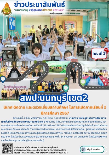 วันจันทร์ ที่ 4 เดือน พฤศจิกายน พ.ศ. 2567 เวลา 09.00 น. นายเทวัน พอใจ ผู้อำนวยการสำนักงานเขตพื้นที่การศึกษาประถมศึกษานนทบุรี เขต 2 พร้อมด้วย ผู้อำนวยการกลุ่มฯ และศึกษานิเทศก์ นิเทศ ติดตาม และตรวจเยี่ยมสถานศึกษา ในการเปิดภาคเรียนที่ 2 ปีการศึกษา 2567 เพื่อตรวจเยี่ยมสร้างขวัญกำลังใจ ในการดำเนินงานตามนโยบาย ด้านความปลอดภัย ด้านการจัดการเรียนการสอน และสร้างความมั่นใจให้กับนักเรียน ผู้ปกครอง ของโรงเรียนในสังกัด ได้เปิดภาคเรียนอย่างมีความสุขภายใต้แนวทางการทำงาน “จับมือไว้ แล้วไปด้วยกัน” ณ โรงเรียนวัดเอนกดิษฐาราม, โรงเรียนบ้านหนองเพรางาย (สลากกินแบ่งสงเคราะห์ที่ 364 หอมบุญ – นาค อนุเคราะห์), โรงเรียนวัดเพรางาย และ โรงเรียนอนุบาลบางใหญ่ (ดอนลาดตะค้าน)