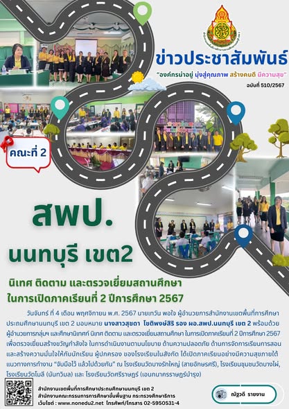วันจันทร์ ที่ 4 เดือน พฤศจิกายน พ.ศ. 2567 นายเทวัน พอใจ ผู้อำนวยการสำนักงานเขตพื้นที่การศึกษาประถมศึกษานนทบุรี เขต 2 มอบหมาย นางสาวสุชดา โชติพงษ์สิริ รอง ผอ.สพป.นนทบุรี เขต 2 พร้อมด้วย ผู้อำนวยการกลุ่มฯ และศึกษานิเทศก์ นิเทศ ติดตาม และตรวจเยี่ยมสถานศึกษา ในการเปิดภาคเรียนที่ 2 ปีการศึกษา 2567 เพื่อตรวจเยี่ยมสร้างขวัญกำลังใจ ในการดำเนินงานตามนโยบาย ด้านความปลอดภัย ด้านการจัดการเรียนการสอน และสร้างความมั่นใจให้กับนักเรียน ผู้ปกครอง ของโรงเรียนในสังกัด ได้เปิดภาคเรียนอย่างมีความสุขภายใต้แนวทางการทำงาน “จับมือไว้ แล้วไปด้วยกัน” ณ โรงเรียนวัดบางรักใหญ่ (สายอักษรศรี), โรงเรียนชุมชนวัดบางไผ่, โรงเรียนวัดโมลี (นันทวิมล) และ โรงเรียนวัดศรีราษฎร์ (เอนกนาครราษฎร์บำรุง)