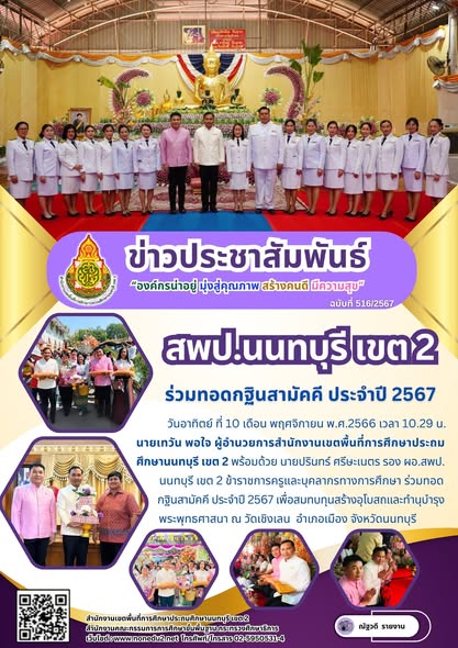 วันอาทิตย์ ที่ 10 เดือน พฤศจิกายน พ.ศ.2566 เวลา 10.29 น. นายเทวัน พอใจ ผู้อำนวยการสำนักงานเขตพื้นที่การศึกษาประถมศึกษานนทบุรี เขต 2 พร้อมด้วย นายปรินทร์ ศรีษะเนตร รอง ผอ.สพป.นนทบุรี เขต 2 ข้าราชการครูและบุคลากรทางการศึกษา ร่วมทอดกฐินสามัคคี ประจำปี 2567 เพื่อสมทบทุนสร้างอุโบสถและทำนุบำรุงพระพุทธศาสนา ณ วัดเชิงเลน อำเภอเมือง จังหวัดนนทบุรี