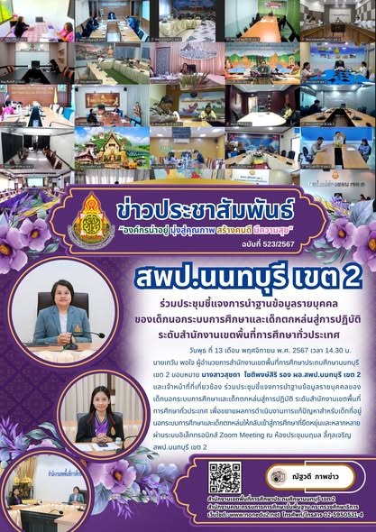 วันพุธ ที่ 13 เดือน พฤศจิกายน พ.ศ. 2567 เวลา 14.30 น. นายเทวัน พอใจ ผู้อำนวยการสำนักงานเขตพื้นที่การศึกษาประถมศึกษานนทบุรี เขต 2 มอบหมาย นางสาวสุชดา โชติพงษ์สิริ รอง ผอ.สพป.นนทบุรี เขต 2 และเจ้าหน้าที่ที่เกี่ยวข้อง ร่วมประชุมชี้แจงการนำฐานข้อมูลรายบุคคลของเด็กนอกระบบการศึกษาและเด็กตกหล่นสู่การปฏิบัติ ระดับสำนักงานเขตพื้นที่การศึกษาทั่วประเทศ เพื่อขยายผลการดำเนินงานการแก้ปัญหาสำหรับเด็กที่อยู่นอกระบบการศึกษาและเด็กตกหล่นให้กลับเข้าสู่การศึกษาที่ยืดหยุ่นและหลากหลาย ผ่านระบบอิเล็กทรอนิกส์ Zoom Meeting ณ ห้องประชุมนฤมล ลี้กุลเจริญ สพป.นนทบุรี เขต 2