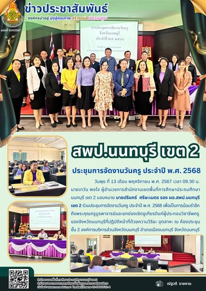 วันพุธ ที่ 13 เดือน พฤศจิกายน พ.ศ. 2567 เวลา 09.30 น. นายเทวัน พอใจ ผู้อำนวยการสำนักงานเขตพื้นที่การศึกษาประถมศึกษานนทบุรี เขต 2 มอบหมาย นายปรินทร์ ศรีษะเนตร รอง ผอ.สพป.นนทบุรี เขต 2 ร่วมประชุมการจัดงานวันครู ประจำปี พ.ศ. 2568 เพื่อเป็นการน้อมรำลึกถึงพระคุณครูบูรพาจารย์และยกย่องเชิดชูเกียรติแก่ผู้ประกอบวิชาชีพครูของจังหวัดนนทบุรีที่ปฏิบัติหน้าที่ด้วยความวิริยะ อุตสาหะ ณ ห้องประชุม ชั้น 2 องค์การบริหารส่วนจังหวัดนนทบุรี อำเภอเมืองนนทบุรี จังหวัดนนทบุรี
