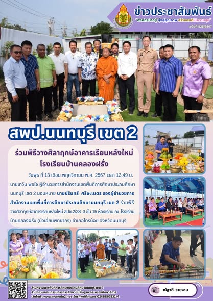 วันพุธ ที่ 13 เดือน พฤศจิกายน พ.ศ. 2567 เวลา 13.49 น. นายเทวัน พอใจ ผู้อำนวยการสำนักงานเขตพื้นที่การศึกษาประถมศึกษานนทบุรี เขต 2 มอบหมาย นายปรินทร์ ศรีษะเนตร รองผู้อำนวยการสำนักงานเขตพื้นที่การศึกษาประถมศึกษานนทบุรี เขต 2 ร่วมพิธีวางศิลาฤกษ์อาคารเรียนหลังใหม่ สปช.2/28 3 ชั้น 15 ห้องเรียน ณ โรงเรียนบ้านคลองฝรั่ง (บัวเอี่ยมพิทยากร) อำเภอไทรน้อย จังหวัดนนทบุรี