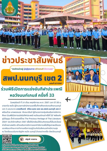 วันพฤหัสบดี ที่ 14 เดือน พฤศจิกายน พ.ศ. 2567 เวลา 07.00 น. นายเทวัน พอใจ ผู้อำนวยการสำนักงานเขตพื้นที่การศึกษาประถมศึกษานนทบุรี เขต 2 มอบหมาย นายปรินทร์ ศรีษะเนตร รอง ผอ.สพป.นนทบุรี เขต 2 พร้อมด้วย นางพรรณรส ศิระธนารัณฑ์ ผู้อำนวยการกลุ่มส่งเสริมการจัดการศึกษา ร่วมพิธีเปิดการแข่งขันกีฬาประเพณี หอวังนนท์เกมส์ ครั้งที่ 33 “พลังแห่งภูมิปัญญา ล้ำค่าวรรรคดีไทย The Precious Heritage of Thai Literature 2024” ประจำปีการศึกษา 2567 เพื่อให้นักเรียนได้ร่วมกิจกรรมที่เป็นประโยชน์ห่างไกลยาเสพติด สร้างเสริมการรักการออกกำลังกายเพื่อให้สุขภาพแข็งแรงและพัฒนาทักษะการทำงานหรือการอยู่ร่วมกันในสังคมอย่างมีความสุข ณ โรงเรียนนวมินทราชินูทิศ หอวัง นนทบุรี อำเภอปากเกร็ด จังหวัดนนทบุรี