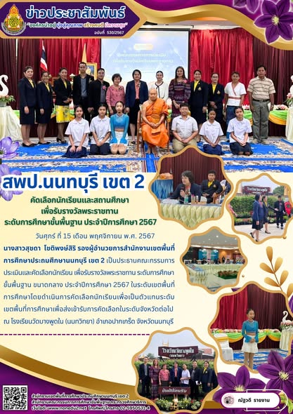 วันศุกร์ ที่ 15 เดือน พฤศจิกายน พ.ศ. 2567 นางสาวสุชดา โชติพงษ์สิริ รองผู้อำนวยการสำนักงานเขตพื้นที่การศึกษาประถมศึกษานนทบุรี เขต 2 เป็นประธานคณะกรรมการประเมินและคัดเลือกนักเรียน เพื่อรับรางวัลพระราชทาน ระดับการศึกษาขั้นพื้นฐาน ขนาดกลาง ประจำปีการศึกษา 2567 ในระดับเขตพื้นที่การศึกษาโดยดำเนินการคัดเลือกนักเรียนเพื่อเป็นตัวแทนระดับเขตพื้นที่การศึกษาเพื่อส่งเข้ารับการคัดเลือกในระดับจังหวัดต่อไป ณ โรงเรียนวัดบางพูดใน (นนทวิทยา) อำเภอปากเกร็ด จังหวัดนนทบุรี