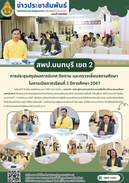 วันจันทร์ ที่ 18 เดือน พฤศจิกายน พ.ศ. 2567 เวลา 14.00 น. นายเทวัน พอใจ ผู้อำนวยการสำนักงานเขตพื้นที่การศึกษาประถมศึกษานนทบุรี เขต 2 เป็นประธานการประชุมสรุปผลการนิเทศ ติดตาม และตรวจเยี่ยมสถานศึกษา ในการเปิดภาคเรียนที่ 2 ปีการศึกษา 2567 จำนวน 63 โรงเรียน ระหว่างวันที่ 1-7 พฤศจิกายน 2567 เพื่อให้สถานศึกษาได้เตรียมการปฏิบัติงานและสร้างความมั่นใจให้กับนักเรียน ผู้ปกครอง ของโรงเรียนในสังกัดได้เปิดเรียนอย่างมีความสุข ทำให้สถานศึกษาเป็น “ องค์กรน่าอยู่ มุ่งสู่คุณภาพ สร้างคนดี มีความสุข” ภายใต้แนวทางการทำงาน“จับมือไว้แล้วไปด้วยกัน” ณ ห้องประชุมนนทคุณพิพัฒน์ สพป.นนทบุรี เขต 2